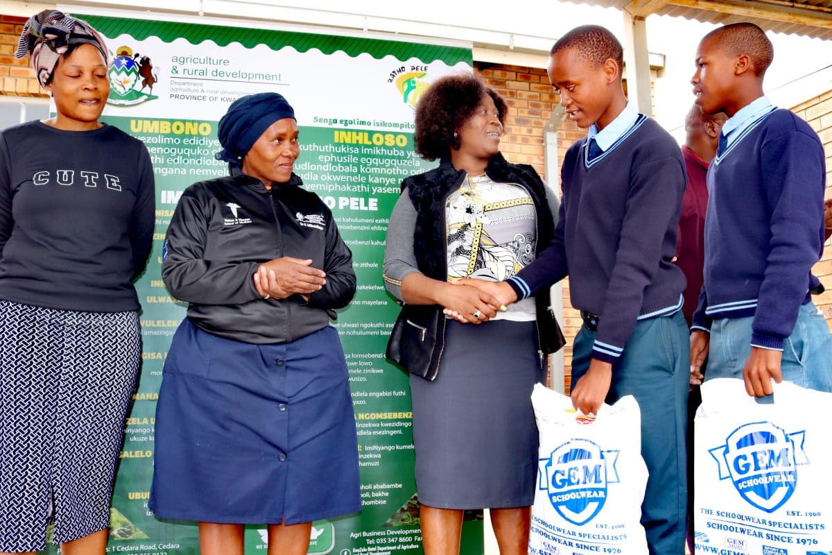 MEC Mrs Bongiwe Sithole-Moloi hands over uniforms to school children at Mgazi High School